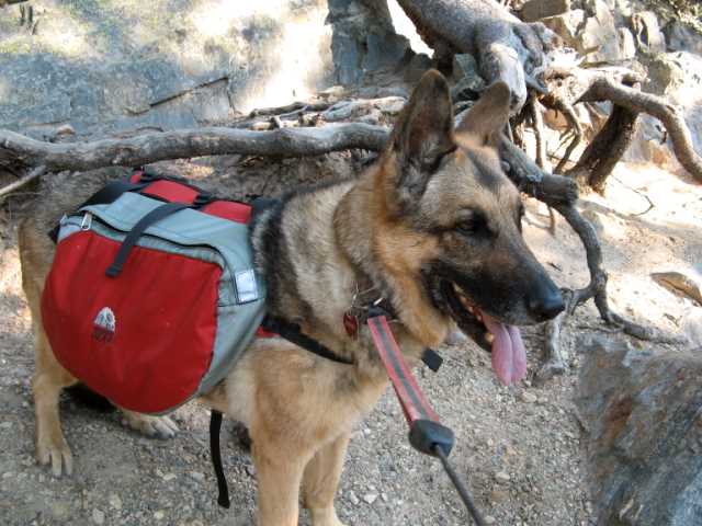 Cora was great on our backpacking trip. To begin with, she was a total trooper about the backpack. It wasn’t easy to get it on her; every time I tried to slip the pack on over her head, she would drop her chin. I eventually outsmarted her. I put her in a down so she couldn’t get away from me. The amazing thing is that she didn’t do anything to try and get it off once I got it on. During the hike in, she was her usual, bouncy self, keeping an eye on all five people in our party as good shepherd should. She acted as if she were completely unaware of the pack.