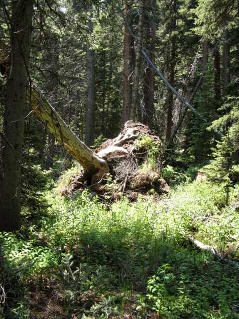 These exposed tree roots were hanging out from under a clump of scrubby bushes on the slope we climbed to get to Emmaline Lake. (Note: Kurt and I did not approach the Lake on the official trail. In skirting a snow field, we wound up blazing our own trail on a slope nearby.)