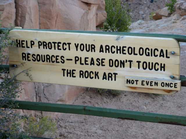 While the canyon itself is spectacular – deep and wide with steep rock walls and lots of trees along the mostly dry stream bed – an added attraction is several panels of ancient pictograms. As we took the trail down into the canyon, we were met by this sign: