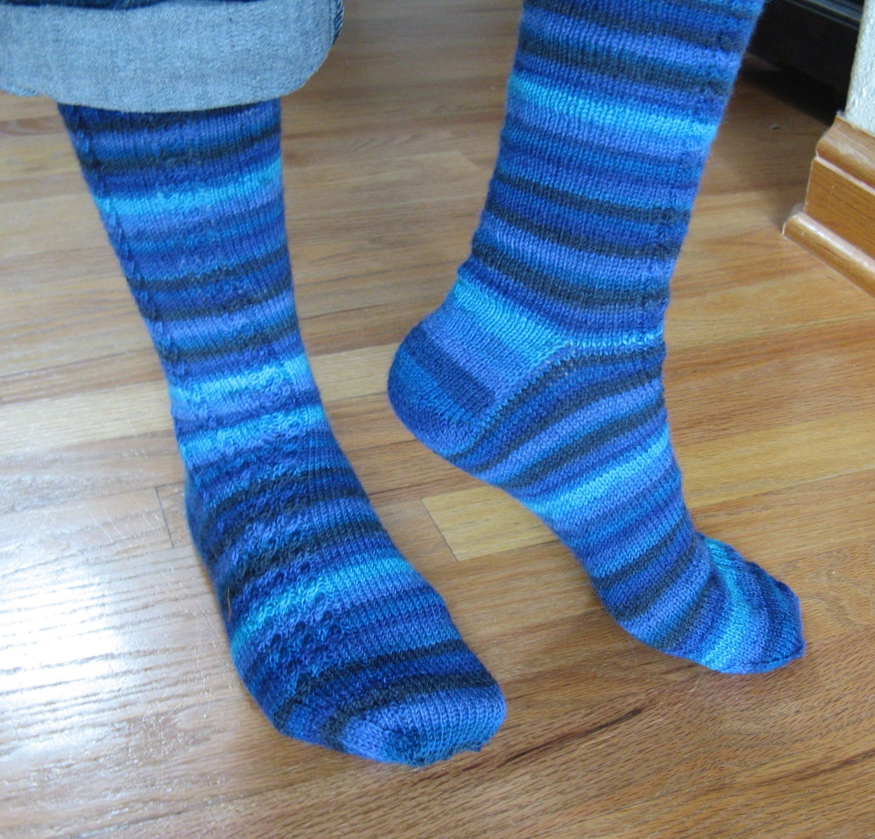 I had to unravel part of the left sock so I could reshape the toe, and to look up Kitchener stitch in another book, but I finally got these socks done. It turns out Kitchener stitch isn’t quite the perfect join I thought it was. There’s one edge that is bumpy and doesn’t blend in with the stockinette stitch. That knowledge, plus having tried multiple times to get it to work, helped me to be satisfied with my final try. It also looks a lot better on a short seam than a long one.